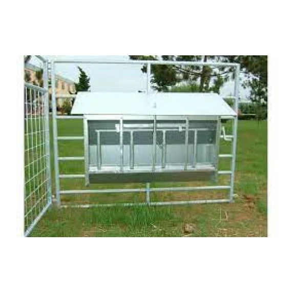 Denne kraftforautomaten egner seg ypperlig i mindre fjøs. Den har justerbar etefront som gjør at voksne sauer ikke får tilgang. Den er fjærbelastet slik at hvis først voksne dyr får hodet inn, så får de det lett ut igjen.