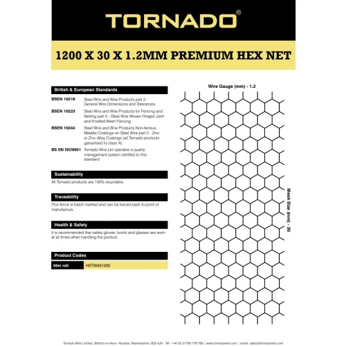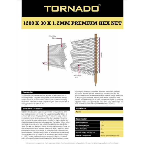 1200 x 30 x 1,2 mm Premium Hex Net egner seg meget godt til inngjerding av kaniner og andre små dyr.. Integrerte kanttråder gir ekstra styrke, og nettet kan begraves eller brettes ut om nødvendig for å forhindre graving under. Tornados Premium-serie er heavily galvanised for lang levetid.
