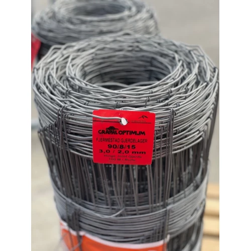 8 horisontale tråder og 15 cm avstand mellom de vertikale trådene. Topp og bunntråd er 3,0mm, mellomtrådene er 2,0 mm. Nettingen er ypperlig til alle typer gjerding for storfe og sau.