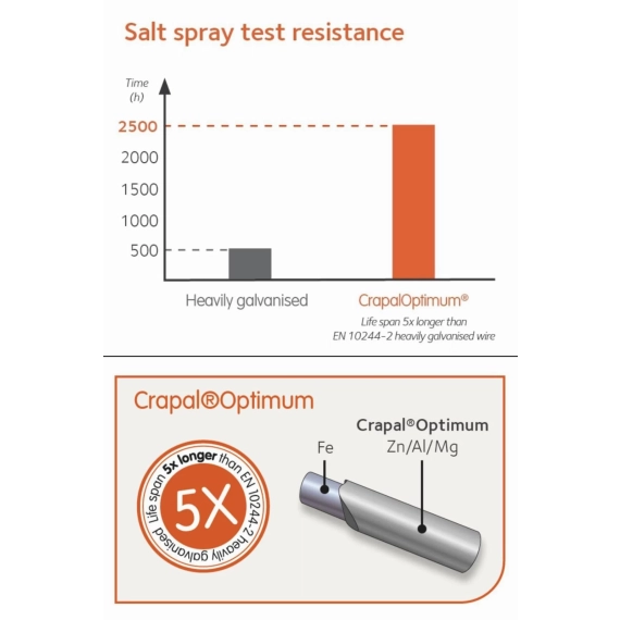 Netting produsert av Crapal®Optimum tråd. Dette er en tråd med zink, aluminium og magnesium som har dokumentert 5 ganger lengre levetid enn vanlig galvanisert tråd. Den er produsert med tvinneknuter ihht standardkrav med