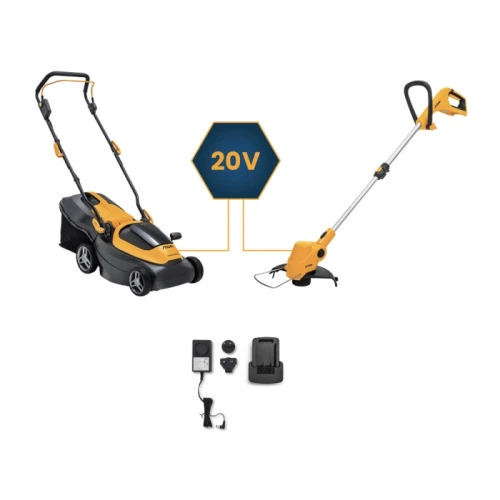 Dette pakkepristilbudet kombinerer en effektiv batteridrevet gressklipper med en brukervennlig gresstrimmer – perfekt for deg som ønsker en velstelt plen og pene kanter med minimal innsats.
